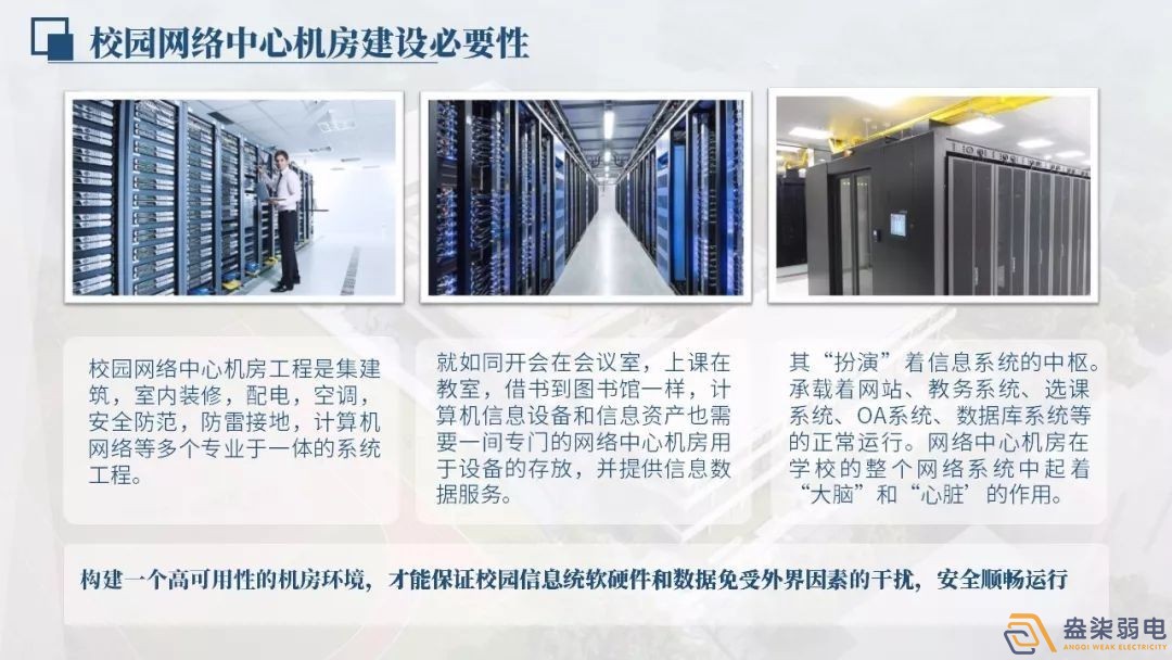 校園網絡機房工程項目它集工程建筑,房屋裝修,配電設備,空調系統,安全防護,防雷接地線,互聯網等多個技術于一體的工程項目。機房系統軟件設計與施工的好壞,會直接關系到機房內網絡系統是不是安全可靠運行。